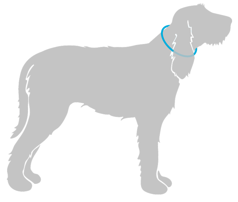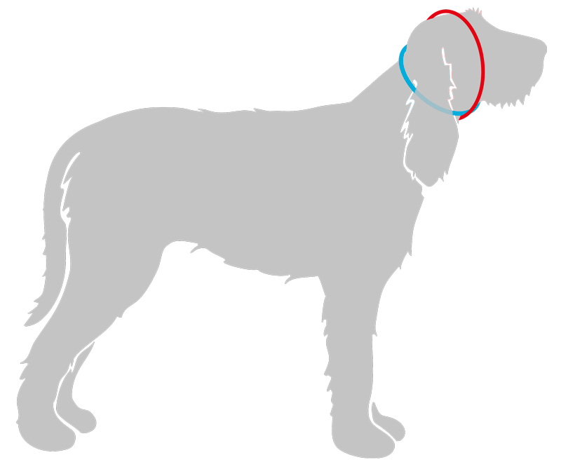 Miss den Kopfumfang deines Hundes auf Höhe der Ohren. Wichtig dabei ist, dass das Maßband sich leicht über den Kopf streifen lässt bzw. es wieder gut ausgezogen werden kann. Bitte aber nicht so weit, dass der Hund es im Freilauf verlieren könnte. Dieses Maß ist beim verstellbaren Halsband nicht nötig!