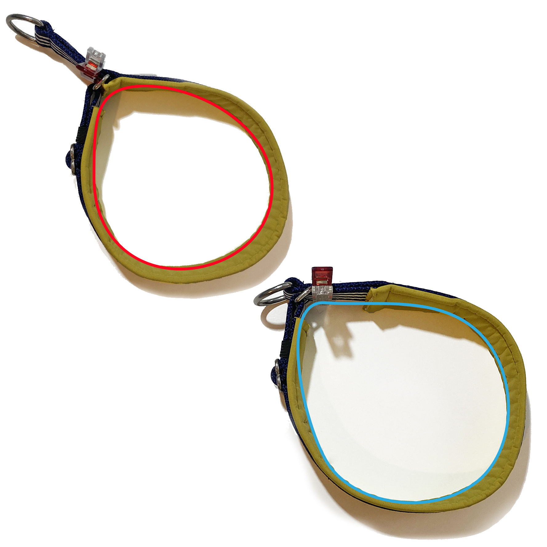 Der Umfang im geöffnetem Zustand von innen ist der Kopfumfang (also mit Zug). Dieses Maß ist beim verstellbaren Halsband nicht nötig!